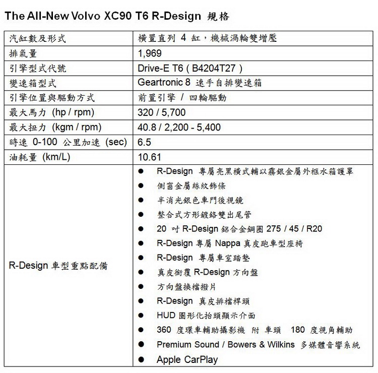 以優雅大器的外型與奢華科技內裝深受層峰買家青睞的 The All-New Volvo XC90,不僅於全球銷售量屢創高峰,在台首批預接單也締造亮眼佳績,上市後銷量更持續升溫,短短不到四個月接單即一舉突破 250 輛。 為了讓國人親身體驗品牌旗艦桀驁不羈的隱性熱血因子,繼發表搭載多項高階配備的頂級 Inscription 車型後,國際富豪汽車正式引進另一高階版本 T6 R-Design 運動化車型,售價 367 萬元,並將於 2016 世界新車大展首度現身,讓所有車迷朋友們感受品牌新世代先鋒別樹一幟的勁酷魅力。 同時 VOLVO 展區也將由 XC90 T6 R-Design 擔綱主軸,帶領旗下休旅、轎旅車大軍,偕同六位 VOLVO 車模打造精彩可期的演出陣容,敬邀所有車迷朋友們蒞臨 2016 年世界新車大展 VOLVO 展區賞車。