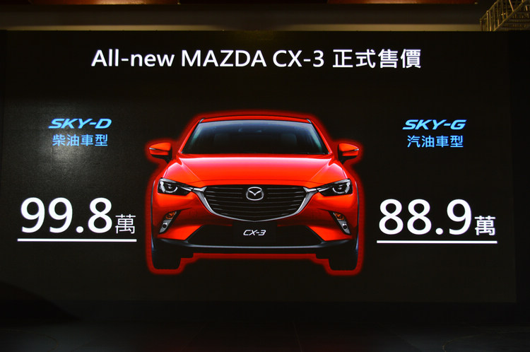 台灣馬自達首次以新銳之姿現身「2016年世界新車大展」,最新跨級距都會跑旅CX-3亦於本次車展正式發表2.0升汽油、1.6升柴油兩種車型,兩款車的外型設計、配備等級全都一模一樣,售價則分別為:88.9萬、99.8萬。