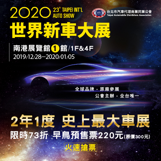 二年一度、公會主辦、原廠參展,國內最大型車展的世界新車大展本屆將於12/28日至2020年1月5日在台北南港展覽館一館1樓與4樓盛大開展。