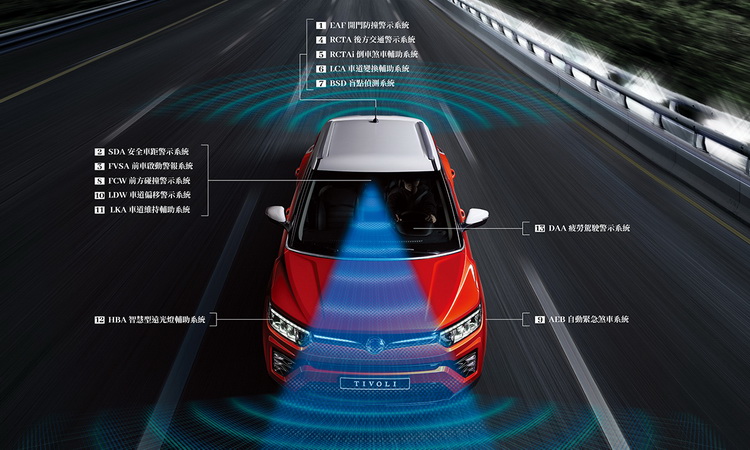 本次2020年小改款《TIVOLI》再度超越自我,全車提升使用79% HSS高強度鋼材,更引進全新SsangYong「Deep Control智能安全輔助系統」,使得原有完善的主動安全科技更臻完美。除了原有的「LDW車道偏移警示」、「LKA車道維持輔助」、「FCW前方碰撞警示」、「AEB自動緊急煞車」、「HBA智慧型遠光燈」等18項主動安全系統外,預計將增加「BSD盲點偵測」、「RCTA後方車側警示」、「RCTAi倒車煞車輔助」、「EAF開門防撞警示」、「SDA安全車距警示」、「FVSA前車啟動警報」、「LCA車道變換輔助」、「DAA疲勞駕駛警示」等多項安全科技。 全新改款TIVOLI主動安全科技系統將高達26項之多,讓TIVOLI堪稱為目前同級中最高C/P值的進口跨界休旅。給予座乘者顛覆過往的先進安全行車體驗。