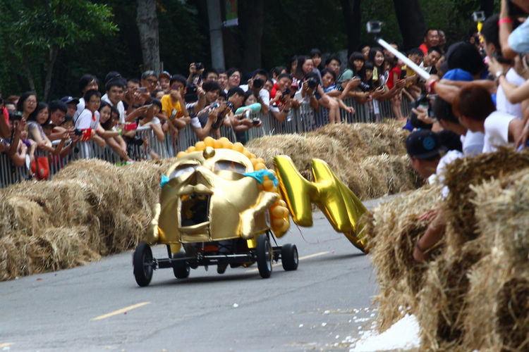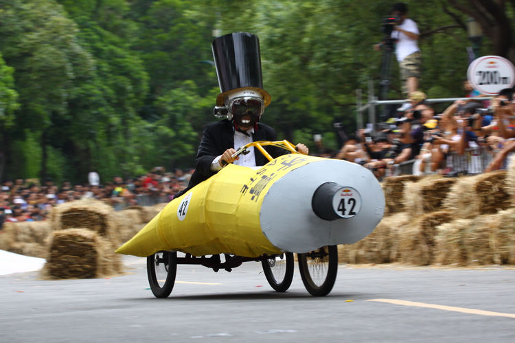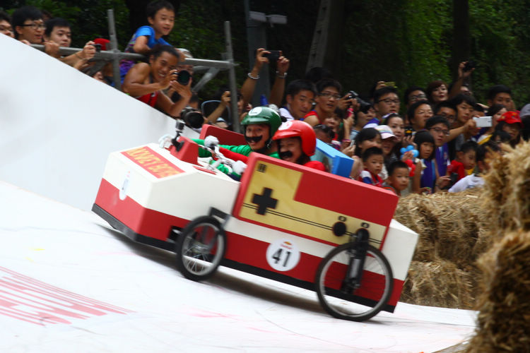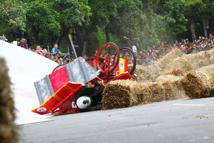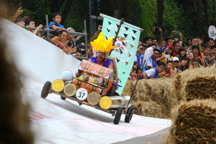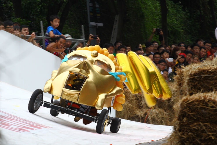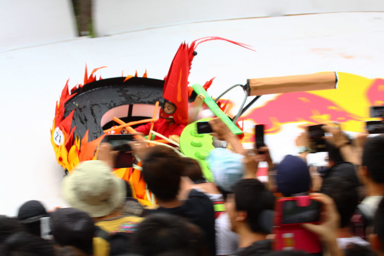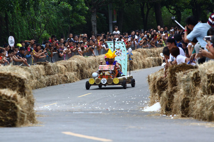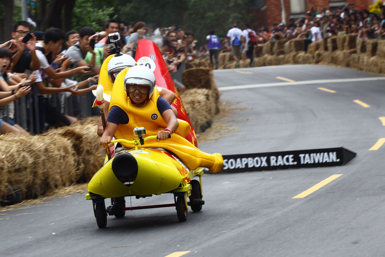 ![]() ▲主辦單位規定賽車不能有任何動力,而且必須具備轉向與煞車的能力。對於觀眾來說,最刺激的當然是每一支隊伍衝下賽道的表現。這次雖然是第一次在台灣舉辦比賽,不過據現場觀察,各隊伍設計的主題飛車大多創意十足,除了部份由單車零件改裝,也有不少是重新打造整個操控結構,以滿足賽事規則中必須要有轉向、煞車系統的規定。 ![]() ▲現場數萬觀眾擠爆週邊道路,對於參賽隊伍充滿幽默感及熱血不吝給予熱情歡呼。![]() ▲這部「美式肌肉車」雖然駕駛的肌肉比賽車還多,不過速度感不錯。![]() ▲糯米團的「什錦炒麵」邊跑沿路還邊掉佐料,最後可惜未能完賽,但駕駛馬念先仍獲得全場歡呼。