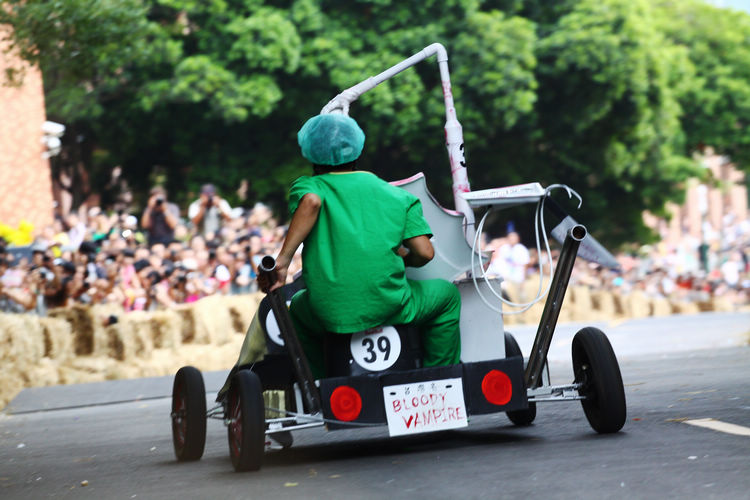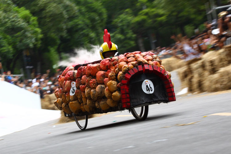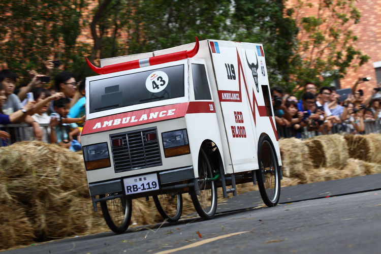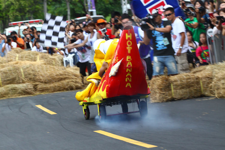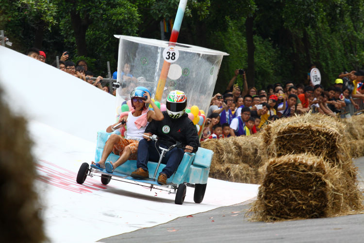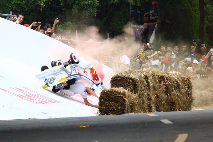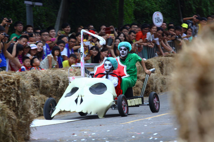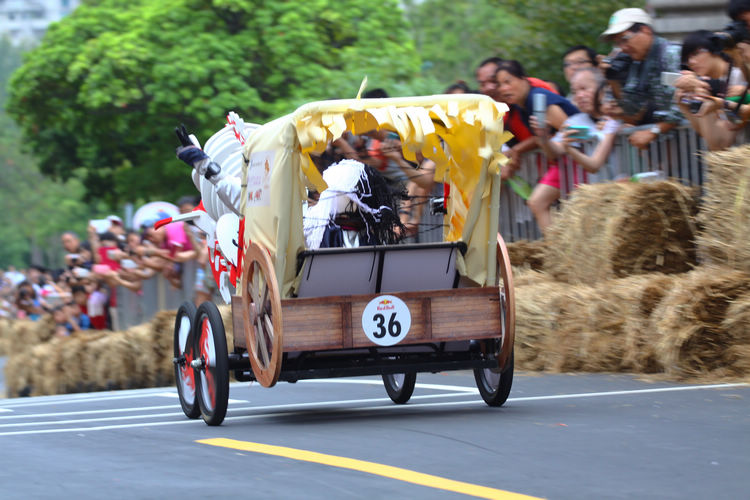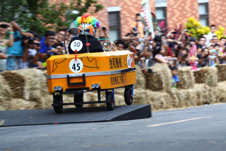 ![]() ▲主辦單位規定賽車不能有任何動力,而且必須具備轉向與煞車的能力。對於觀眾來說,最刺激的當然是每一支隊伍衝下賽道的表現。這次雖然是第一次在台灣舉辦比賽,不過據現場觀察,各隊伍設計的主題飛車大多創意十足,除了部份由單車零件改裝,也有不少是重新打造整個操控結構,以滿足賽事規則中必須要有轉向、煞車系統的規定。 ![]() ▲現場數萬觀眾擠爆週邊道路,對於參賽隊伍充滿幽默感及熱血不吝給予熱情歡呼。![]() ▲這部「美式肌肉車」雖然駕駛的肌肉比賽車還多,不過速度感不錯。![]() ▲糯米團的「什錦炒麵」邊跑沿路還邊掉佐料,最後可惜未能完賽,但駕駛馬念先仍獲得全場歡呼。