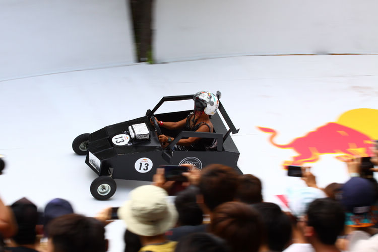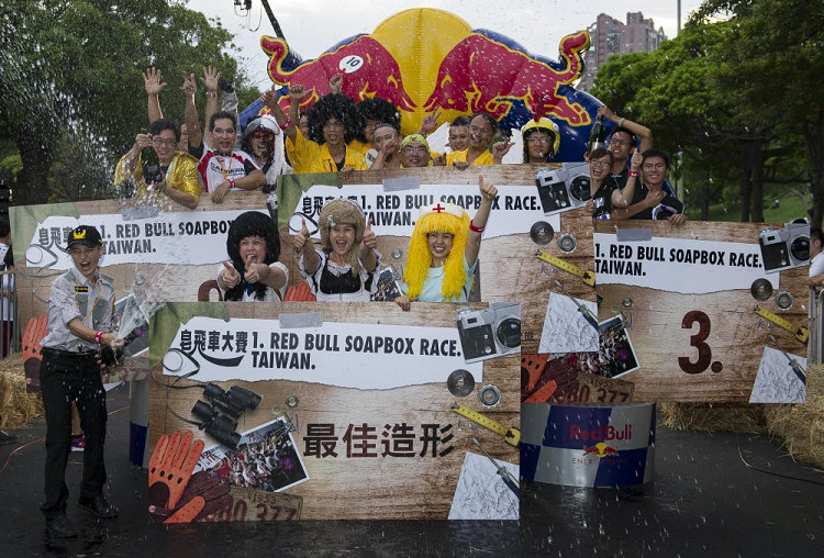 ![]() ▲「筆咧」駕駛為當日壽星,最後也順利成為台灣首屆Red Bull 皂飛車大賽冠軍。皂飛車(Soap Box Race)大賽的起源是歐洲小孩的遊戲,用裝肥皂的木箱子裝上四個車輪,然後推著在路上玩的簡單玩具車。後來Williams F1車隊的Gordan Murray將它化身為正式比賽,不過仍維持無動力車,加上趣味為主、競速為輔的精神,之後更更納入著名的Goodwood賽車嘉年華,最後由Red Bull在2000年推廣至全世界,至今13年來已經舉辦數十場皂飛車大賽,今年則是首次引進台灣。 ![]() ▲「爽人牙膏」隊以牙膏造型參賽,車速相當快,也能順利開上碗公彎。![]() ▲皂飛車現場觀眾爆滿,不但把校園擠爆,週邊道路也全部大塞車。![]() ▲「血腥德古拉」有兩人坐鎮,不但車輪有外傾角調整,還有兩根朝天排氣管。