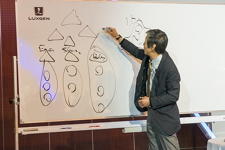▲水野和敏在發表會、訪談的場合除了豐富的手勢外,也少不了在白板上塗塗畫畫以圖形、表格讓媒體者更了解他所做的說明