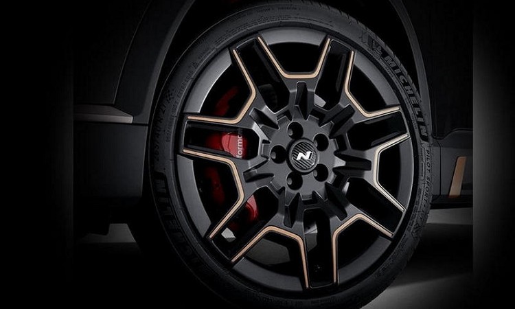 來到車側,最醒目是N部門所設計的一套黑色與金色結合的21吋鋁圈,中間還用上了碳纖維的輪圈蓋,個人覺得整車最好看的地方就屬這套鋁圈。車側還加上獨特的側裙以及車頂延伸至車尾的擾流板,並與車頂裝上縱向車頂架,可架設各種的休閒物品。車尾四出排氣管和碳纖維下擾流,如果光看車尾下半部,很難把它與休旅車連接在一起。