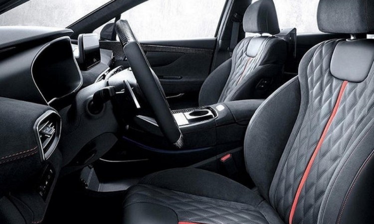 為了要使車外與車內達到連貫性,車內也有運動化套件加持,第一排與第二排座椅特別選用黑色皮革和紅色縫線搭配,前座椅的椅背甚至使用到碳纖維背蓋,提醒乘客這可不是一輛普通的Santa Fe。中控台麂皮包覆,大量運用碳纖維來增添戰鬥氣息,方向盤改為平把式賽車式樣,家庭趨向的休旅車得到全新樣貌。