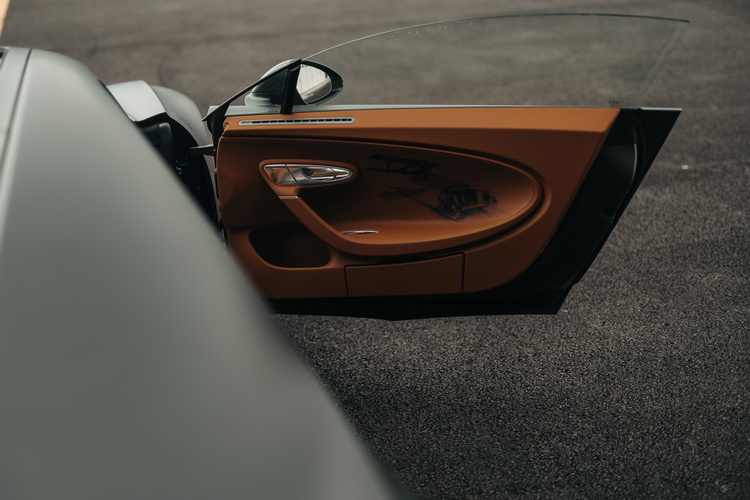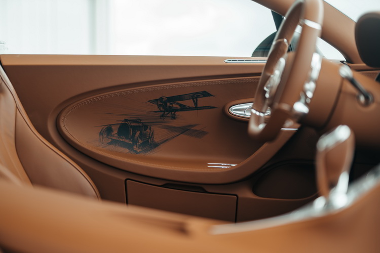 車室內裝在設計上融入了上世紀的航空器元素,整體上以「Gaucho」色調真皮包覆帶出過去飛機上常見的天然皮革復古風情。此外,鋁合金飾板、頭枕上的「Les Legendes du Ciel」logo與「1of20」鋁合金生產序號銘牌等也都凸顯了這部特別車款的不同之處。車門內側則繪有法國於1916年製造的雙翼戰鬥機─Nieuport 17與BUGATTI的名車Type 13。還可選配Skyview玻璃車頂讓駕駛就向上世紀無座艙罩飛機飛行員一樣仰視天空。