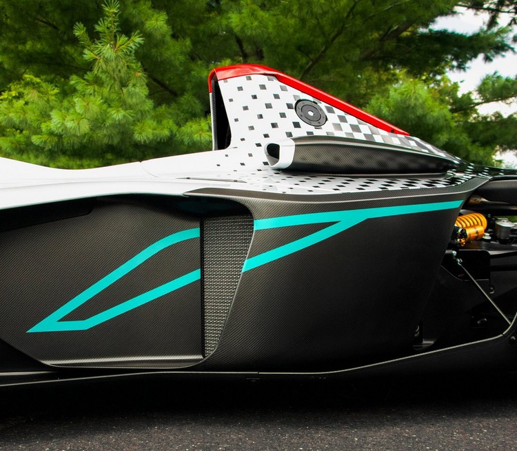 新一代Mono的一號車導入了MAC獨特的製成,是完全按造顧客要求所量身打造的。液態銀金屬車身色從其鯊魚鼻前緣流向經過空氣動力學優化的後方。車尾配有愛琴海藍色的擾流尾翼。整個外觀均有愛琴海藍作為裝飾與金屬液態銀形成鮮明對比。