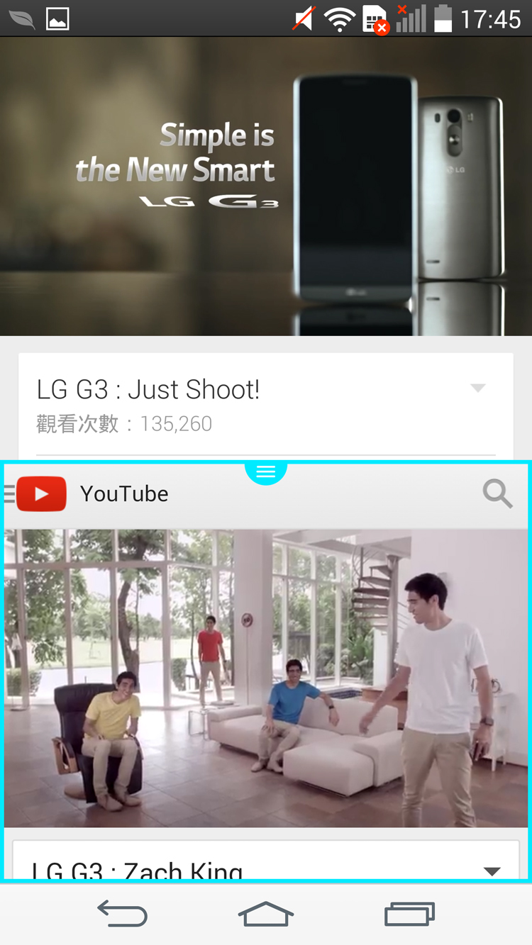 ![]() ▲0.2秒的雷射對焦搭配輕觸即拍功能,讓拍照也可以很輕鬆。至於在快速對焦的部分,這項在G3上導入的功能,在相機開啟後便會持續進行對焦的動作,當使用者在簡易拍攝介面時,只需輕觸螢幕就可以立即拍攝照片,對於需要即時拍攝的玩家來說是一項便捷的設計,實際體驗後筆者發現,這項功能雖然能夠立即拍照,但是仍會有接近一秒的延遲,而且如果不小心開啟了完整的拍照介面,這個輕觸即拍的能力就會失效,玩家使用此功能時要特別的注意。整體來說,雖然G3在拍照的功能與色調上仍有進步的空間,但是無論是在清晰度或是在成像的品質上,都具有非常不錯的水準。 ![]() ▲G3的輕觸即拍的功能,需要在簡易畫面中才能使用。![]() ▲雙視窗模式可同時撥放兩支YOUTUBE影片。