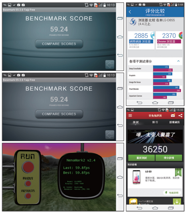 效能實測![]() ▲開機後的基礎記憶體用量大約在1.1G左右。如果你細看各家手機的硬體配置,應該不難發現它們其實大同小異,不過在不一樣的軟硬體配搭方式下,多少還是會有些許的差異出現。 ![]() ▲與不少旗艦手機一樣,G3的螢幕支援10點觸控。![]() ▲G3在每個測試程式中都跑出不錯的分數。
