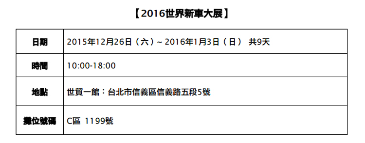 Sony Computer Entertainment Taiwan Limited(SCET)今日宣布,將首次參加「2016世界新車大展」 (展期2015年12月26日~2016年1月3日)。PlayStation®攤位將被打造成PlayStation®4(PS4™)獨佔賽車遊戲『DRIVECLUB™』(中英文合版)的試玩專區,特別設置四台專屬駕駛座椅,來到這裡可以化身帥氣賽車手、免費體驗競速的快感!