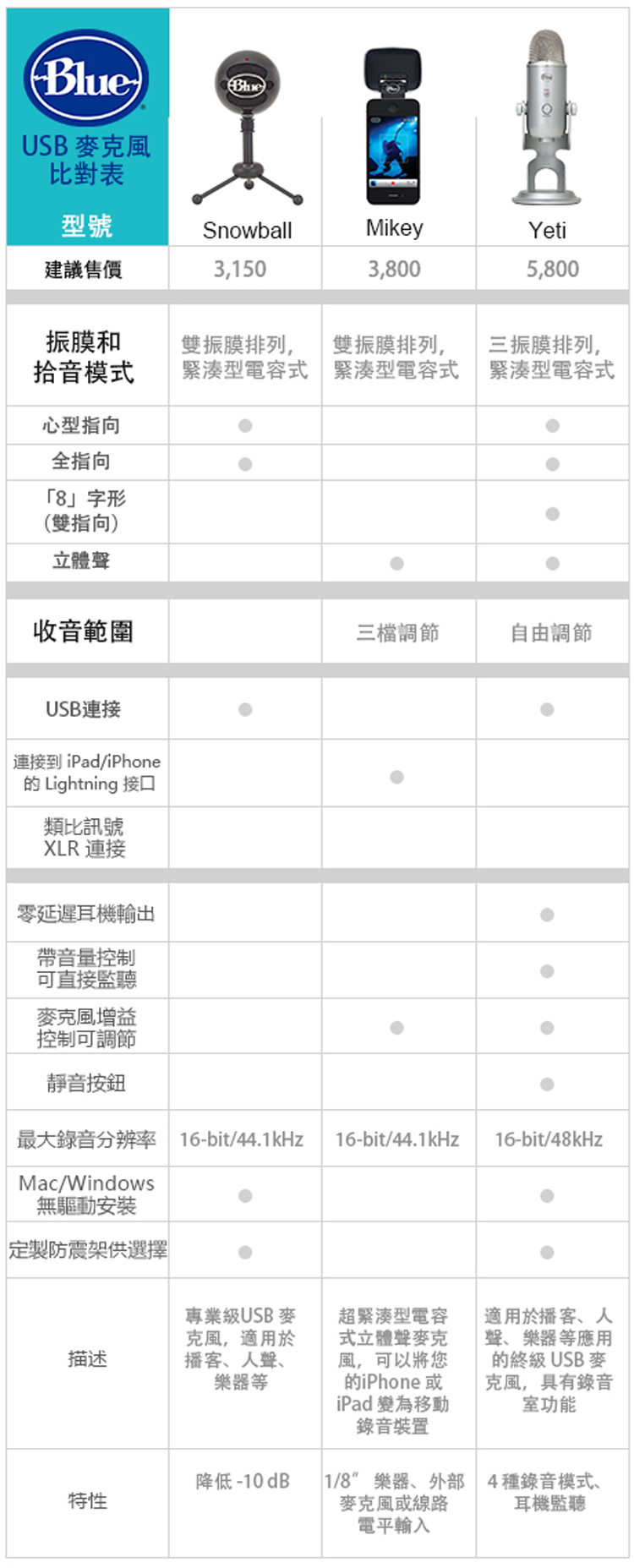 以專業錄音起家,來自美國,深獲眾多直播主、音樂創作人、潮流人士和電競玩家喜愛的的頂尖耳機、USB麥克風的獨立廠牌--Blue,宣告正式進入台灣市場!看準台灣直播市場潛力、網紅商機、以及台灣網友無限的創造力,Blue Microphone台灣一舉推出多款明星商品,打破消費者對麥克風的刻板印象,開創全新消費性電子商品市場,包括:Yeti雪怪USB麥克風、Snowball雪球USB麥克風、Mikey Digital隨身麥克風等三款麥克風,以及全球首創內建兩段式擴大機的Mo-Fi發燒級耳罩式耳機和LOLA全音域耳罩式耳機兩款耳機。