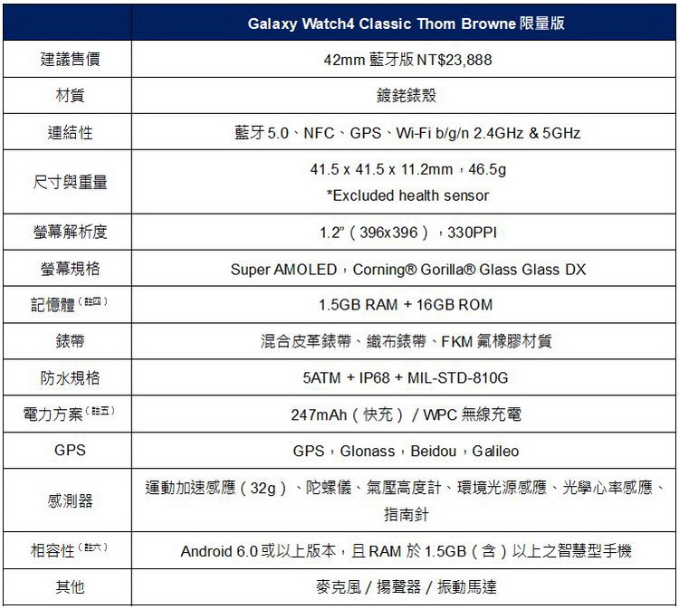 三星電子於今年8月推出Galaxy Z Fold3︱Flip3 5G Thom Browne Edition限量版,在台開放預購後5分鐘,即旋風預購完售,顯見用戶對科技品味的重視與需求。有感於行動裝置的功能性已不足以作為用戶選購產品的唯一考量,三星再次與指標時尚品牌Thom Browne攜手推出Galaxy Watch4 Classic Thom Browne限量版,以Thom Browne經典的三色條紋設計,為強大效能的機身賦予精品質感,滿足用戶對功能及時尚品味的雙重渴望。 Galaxy Watch4 Classic與Thom Browne的跨界結合,將於智慧手錶市場再掀時尚風潮!Galaxy Watch4 Classic Thom Browne 限量版自9月29日中午12點起於三星商城獨家上市,42mm版建議售價NT$23,888,全台限量售完為止。