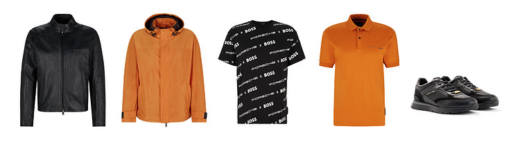 ![]() ▲左至右:PORSCHE X BOSS黑色小羊皮夾克NT$43,900、鮮橘色連帽防水機能性外套NT$17,400、黑色logo印花T恤NT$4,800、鮮橘色Polo衫NT$6,900、黑色皮革拼接運動鞋NT$13,400。