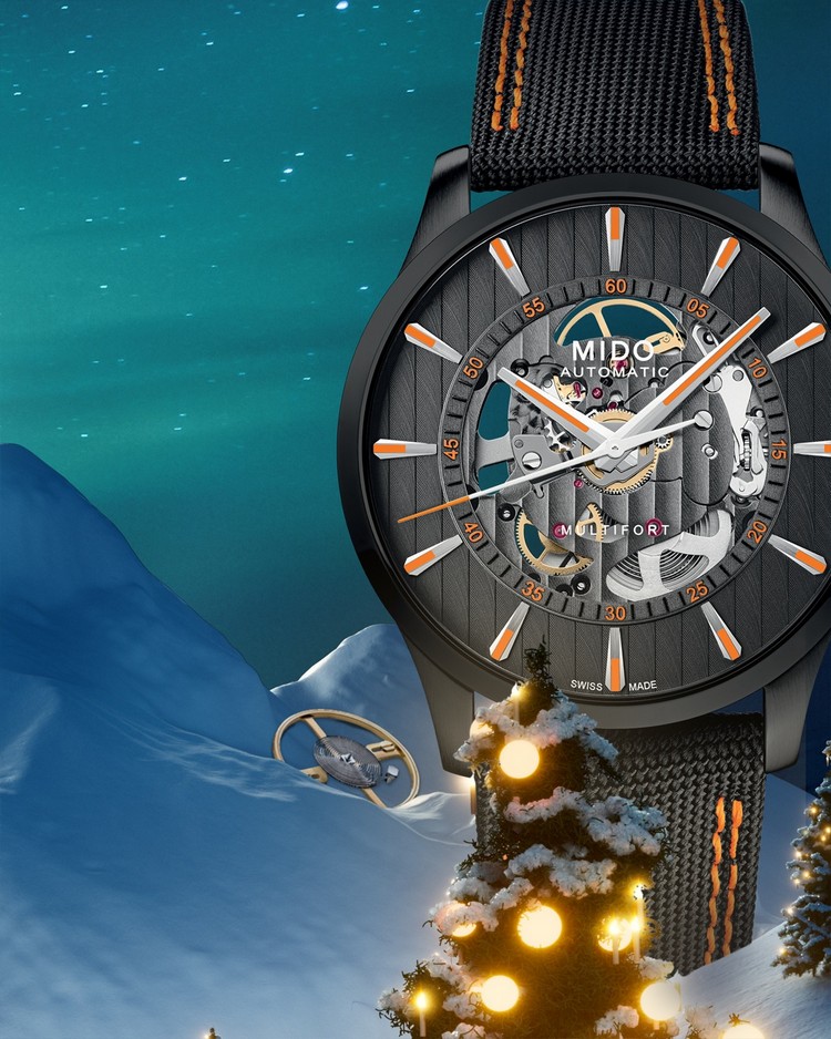 這款腕錶延續 MIDO 經典的 TV 造型錶殼,將品牌自 1973 年以來的代表性設計化為節慶中獨具個性的輪廓。Multifort TV Big Date深藍錶盤向外漸層至黑色,搭配水平拉絲紋理,在燈光與雪景中呈現流動反射,像節慶夜裡從窗面溢出的曙光,把冬季的魔幻感悄悄框進視線。圓形與梯形時標、雙切面指針覆以白色 Super-LumiNova®,在閃爍燈飾間依然明亮。12 點的大日期窗醒目大方,如同節慶倒數時的一束亮光。內部搭載 Caliber 80 與 Nivachron™ 高科技游絲,提供長達 80 小時的動力儲存,象徵節日裡延續的期待。在雪地、燈火與禮物交織的氛圍裡,這枚腕錶以獨有輪廓捕捉每一段即將到來的美好,讓節慶成為永久留存的一幕。