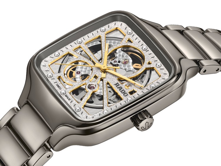 年末的光不一定要喧嘩,有些質感只要角度一轉就會被看見。此款以品牌獨有的電漿高科技陶瓷打造錶殼與鍊帶,呈現介於金屬與高科技陶瓷之間的溫潤光澤,線條俐落卻不冷硬。方形錶殼搭配藍寶石水晶鏡面,使輪廓更乾淨通透。錶盤運用特殊電鑄工藝複製鑽石粉末的晶體結構,形成細緻的金屬紋理質感,並以黃金色立體時標與同色錨型標誌提亮層次。 黃金色指針覆以白色 Super-LumiNova®,在不同光線下依然清晰易讀。腕錶搭載 Rado R734 自動上鍊機芯,具備 80 小時動力儲存、Nivachron™ 防磁游絲並通過五方位調校,讓外在的閃耀與內在的穩定同時到位。